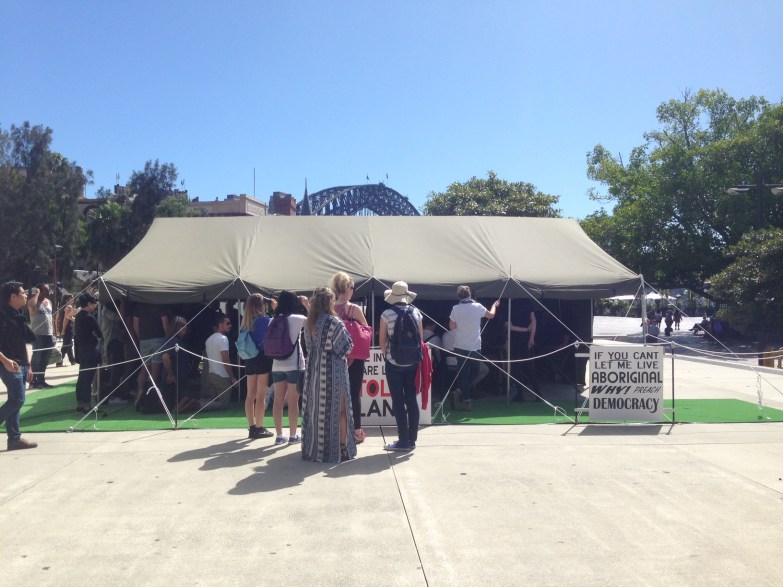 The tour began at the MCA forecourt with Richard Bell’s Embassy – a homage to the original Aboriginal Tent Embassy, established on 26 January 1972 by Redfern-based Aboriginal activists. The Curators’ Department co-founder and former MCA senior curator Glenn Barkley, introduced the installation, explaining the symbolic power and ongoing political resonance of Bell’s work, before directing attention to the public debate taking place inside the tent.