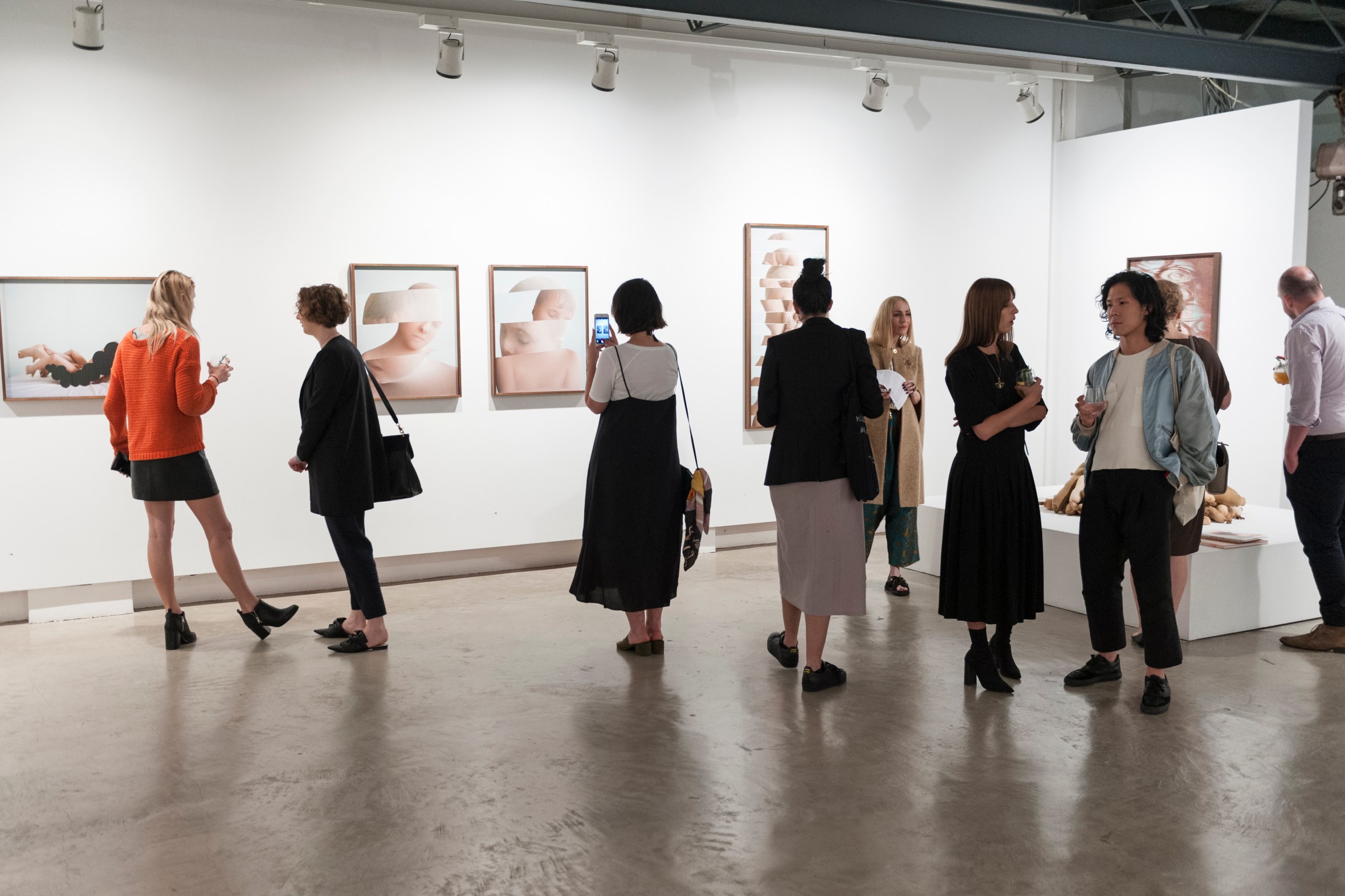 Exhibiting in the gallery upstairs, Polly’s first Sydney solo exhibition, Not Good at Human, was initially a project with her teenage son Louie, after the family moved to LA. The series displays Polly’s ongoing fascination with people, identity, self-image, insecurities, and the more fundamental psychologies of personality. Across the series, cocoon-like figures undergo a transformative process, producing an uncanny and raw sense of beauty. Experiencing these images is at once deeply engaging and somewhat repelling, reflected in the mixed-responses from the Contemporaries audience on the night.